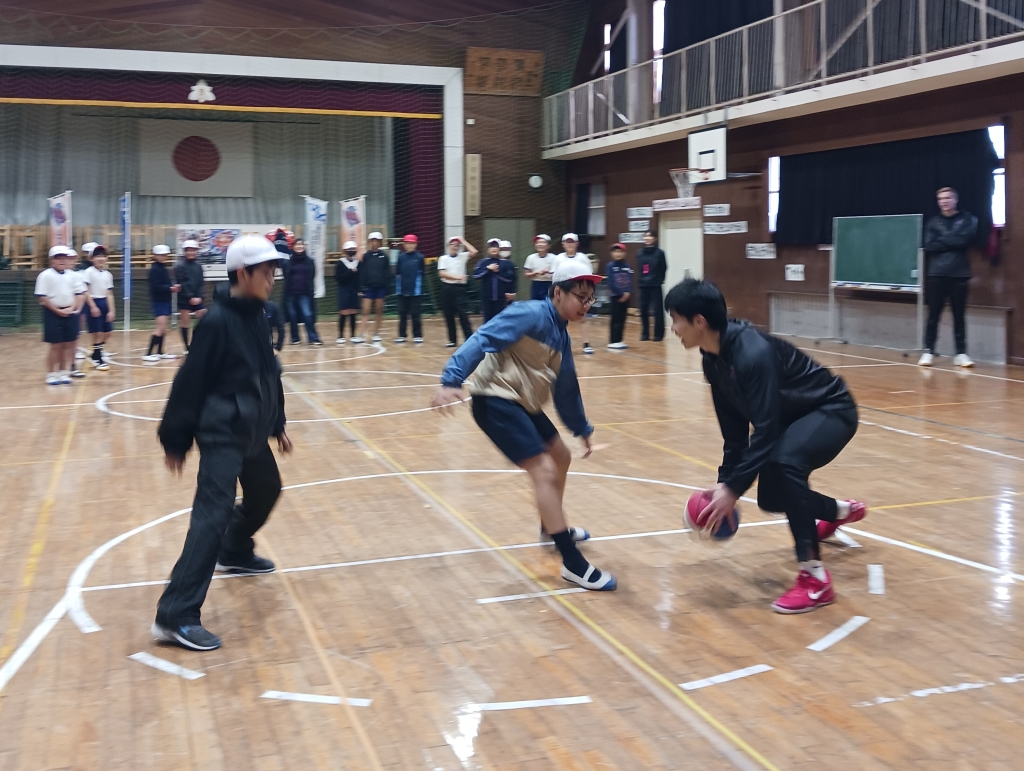 ・内容:ドリブルリレーやシュートバトルなど遊びを交えた基礎指導に加え、ダンクシュートや3ポイントシュートの実演を実施し、バスケットボールの迫力あるプレーを間近に観ることができ、プロアスリートをより身近に感じる時間となりました。講話では、プロバスケットボール選手になるまでのキャリアや夢をテーマに話し、その後の児童からの質問に派遣選手から一つひとつ丁寧に答えていただきました。