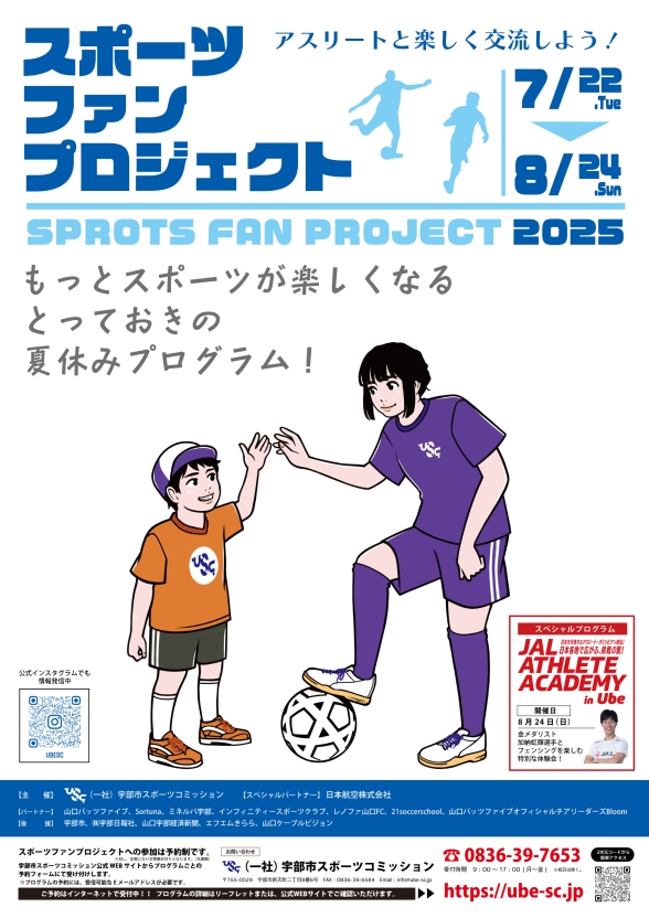 スポーツファンプロジェクトは、当コミッションが主催するスポーツスタート応援事業で、宇部市内の幼児・小学生を中心に、だれもがスポーツを気軽に体験できる機会を提供し、プロ・トップアスリートとの交流を通して、スポーツの楽しさを知ってもらい、興味・関心を高めることでスポーツをはじめるきっかけづくりやスポーツが好きな子ども達を増やし、スポーツ文化を醸成することを目的とした事業です。