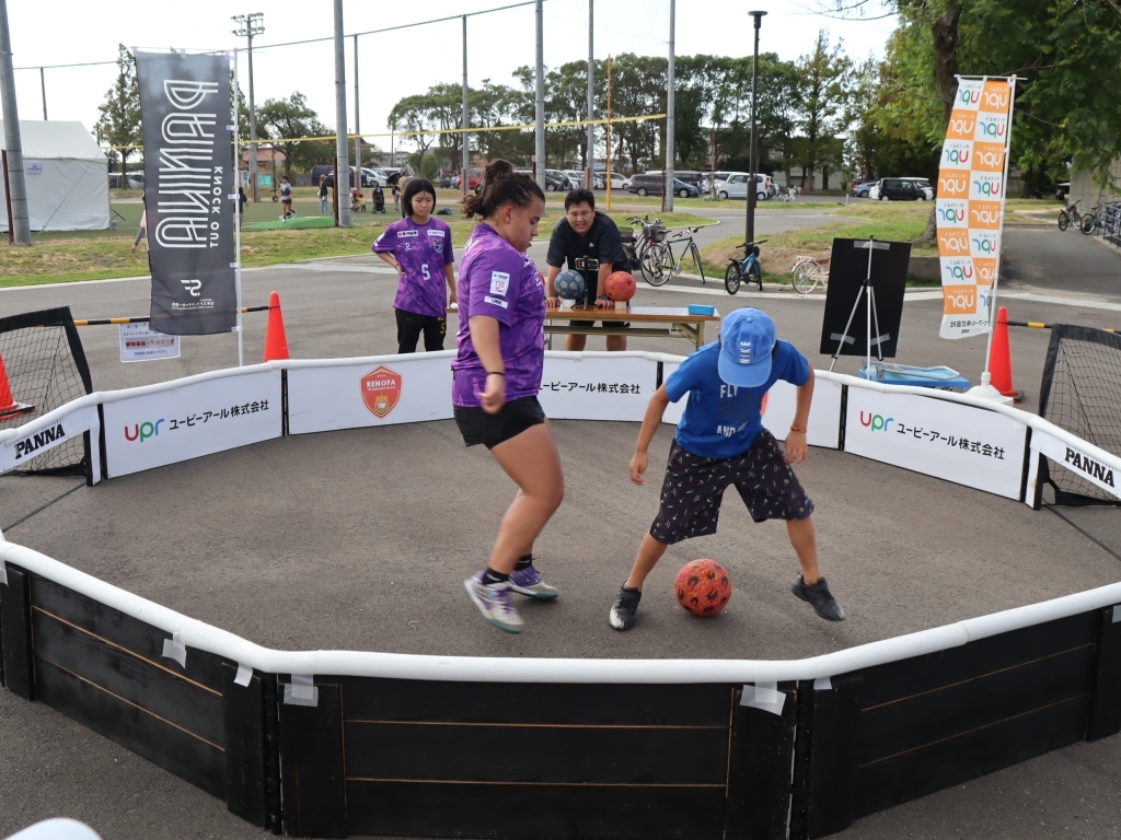 メイン会場の一つであるユーピーアールスタジアムでは、地元の「ミネルバ宇部」の選手と交流できるフットサル体験会や、元S/Jリーガーに挑戦できるバドミントン体験コーナーなど、プロの技に触れる貴重な体験をすることができました。