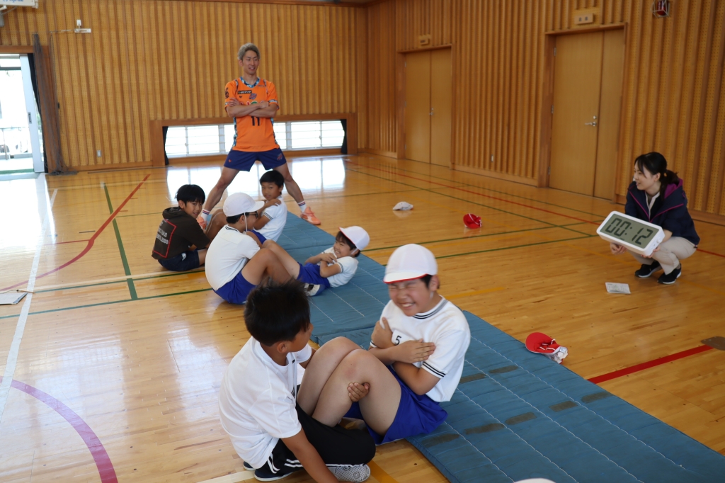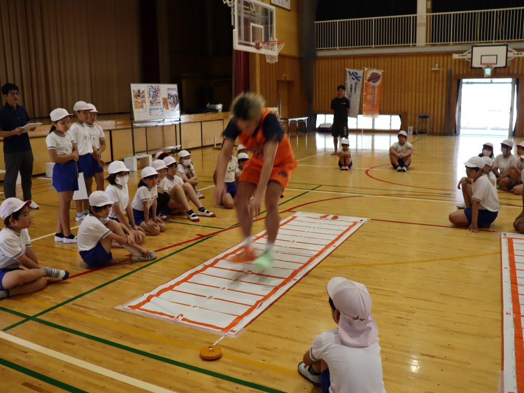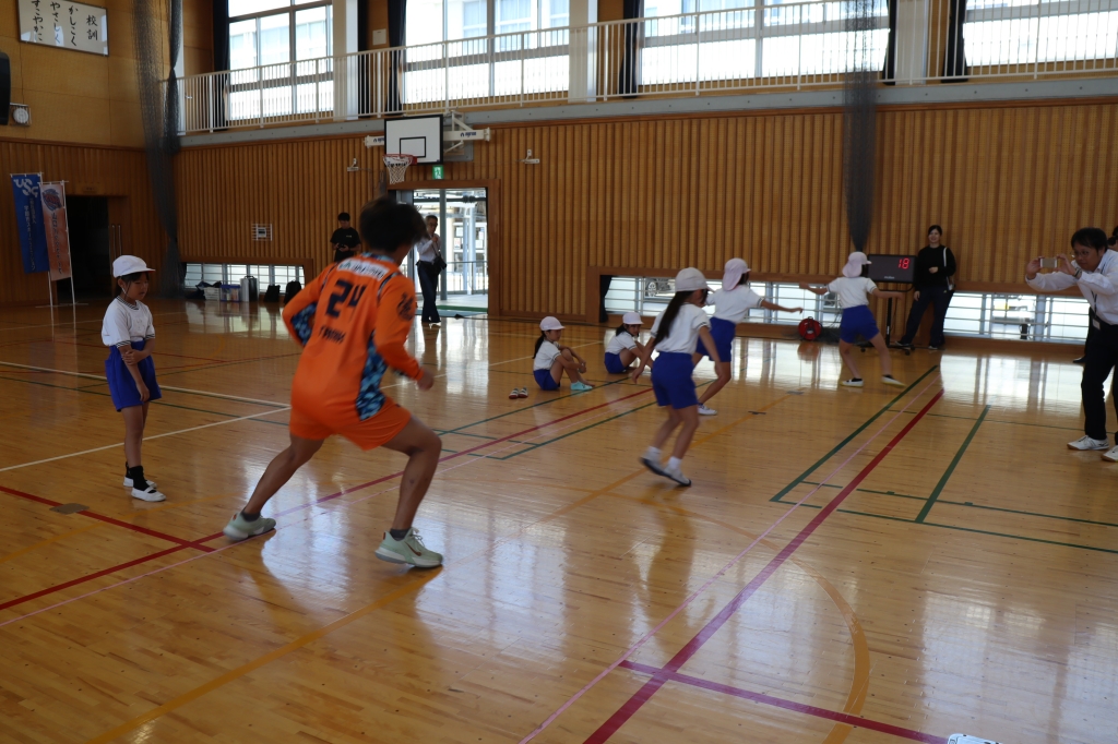 選手が目の前でデモンストレーションを見せ、一緒に汗を流すことで、子どもたちの運動意欲やモチベーションが向上し、体力測定が「選手に挑戦する機会」へと変わり、児童は普段以上の集中力で各種目に取り組んでいました。