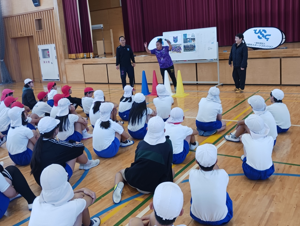 ・内容:現役選手やクラブアンバサダーが小学校を訪問し、サッカーを通じた交流を行いました。運動場でのレクリエーションや、打点の高いヘディング、力強いロングキックなどのプロ技術を披露。講話では、プロになるまでの困難や努力、周囲への感謝について熱く語っていただきました。